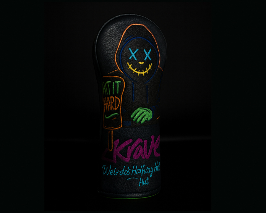 Look at him: hooded trickster stitched in electric oranges, radioactive greens, and blues that hum like nightclub strobes. His grin’s sewn shut, X’s for eyes, holding up a little roadside shrine that says HIT IT HARD — as if it’s some divine revelation scrawled in embroidery. Below, the anarchic scrawl of “Krave” sprawls across the leather like graffiti under a motorway bridge, while “Weirdo’s Halfway Hut” whispers in cheeky turquoise script — a sort of secret society motto for misfit golfers who dare to swing like rebels.